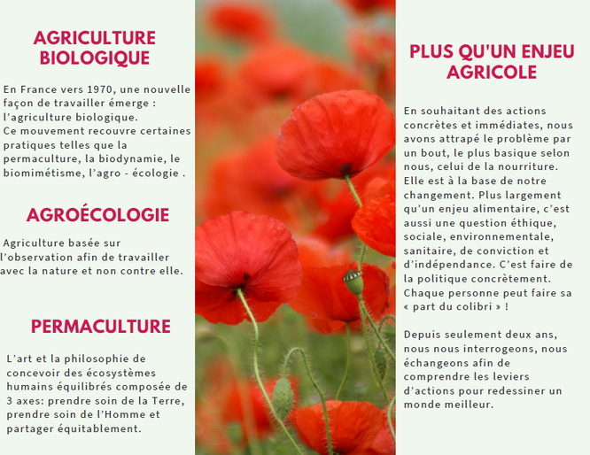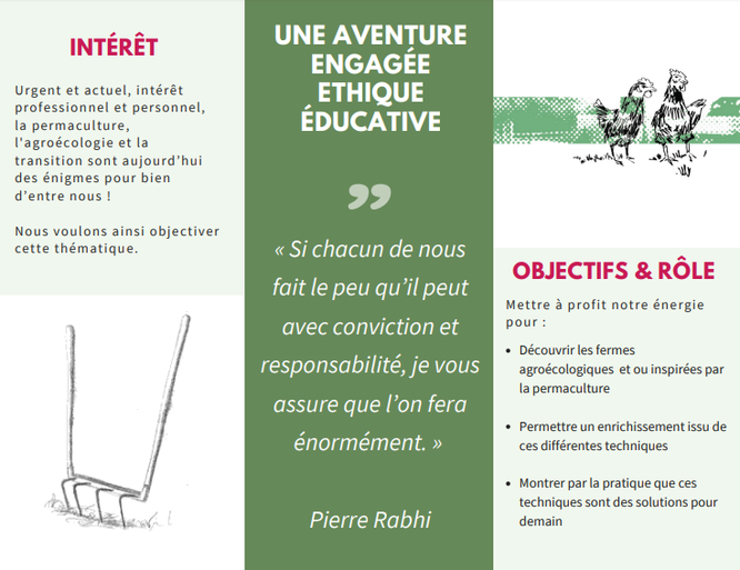 Nous sommes deux jeunes (Claire-Inès & Loïs) de 24 ans s’intéressant à la transition agricole et à la souveraineté alimentaire. A travers nos différentes expériences personnelles et professionnelles nous avons compris que le changement d'un monde plus durable commençait à la fourche et nous voulons en faire partie. Urgent et actuel, intérêt professionnel et personnel, la permaculture et la transition agricole sont aujourd’hui des énigmes pour bien d’entre nous !