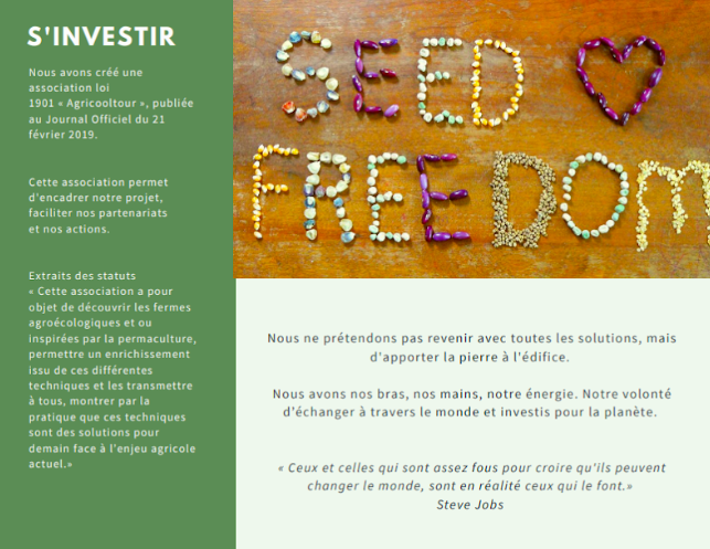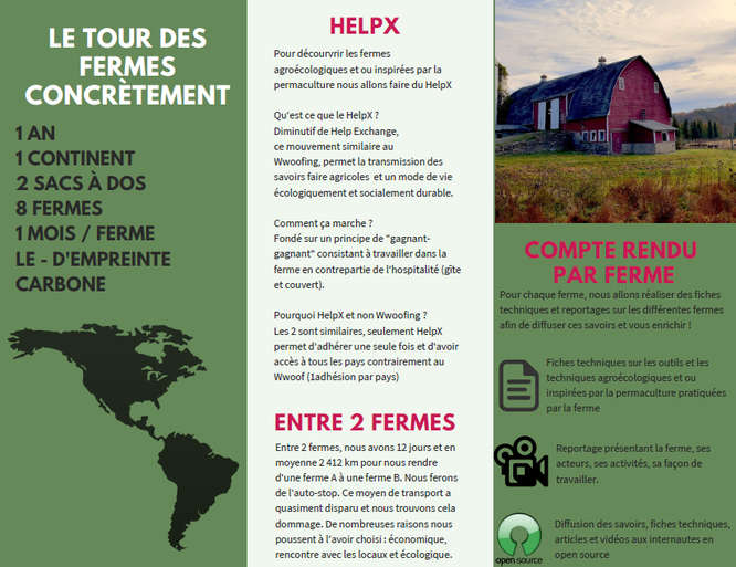 Ainsi à 24 ans, il est en effet temps de nous prouver que nous pouvons être de véritables néo-paysans avec beaucoup de volonté. Nous allons partir durant un an pour découvrir les fermes agroécologiques et inspirées par la permaculture en Amérique (du Sud au Nord) afin d’apprendre et de permettre aux internautes de s’enrichir avec nous.