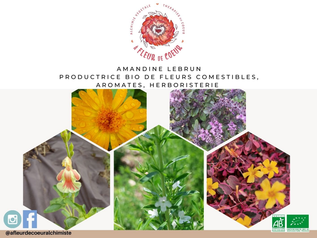 Je m'appelle Amandine et j'ai décidé en 2020 de suivre une formation agricole pour pouvoir produire des fleurs comestibles, plantes aromatiques et médicinales à destination de ma pratique de massages et soins énergétiques; des professionnels des métiers de bouche; des thérapeutes professionnels (naturopathes, diététiciens,...) et des particuliers.