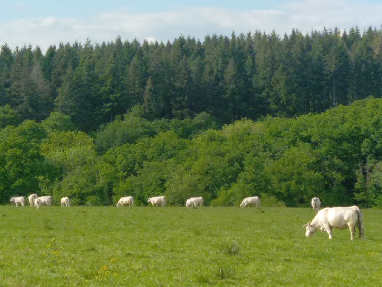 À la ferme, nous élevons des vaches de race Charolaise (50 mères et un taureau), des poulets de plein air Label rouge (quatres bâtiments dont trois ont été construits par mes parents), et des cultures céréalières dans le respect des animaux et de la terre.