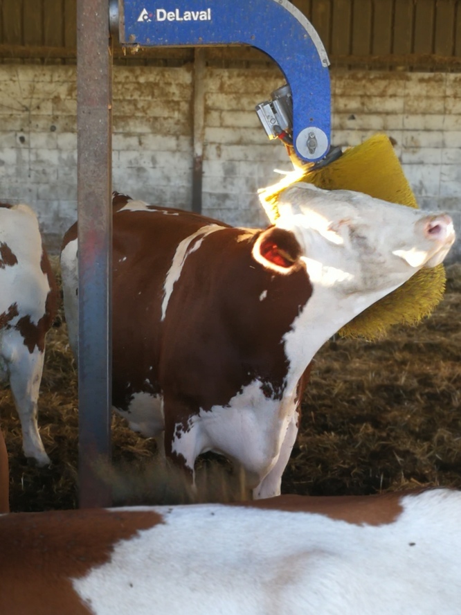 Par ailleurs cette charte reconnaît le logement correct ainsi que le bien être des animaux tout le long de leur vie. L'hiver nos vaches sont placées à l'abri dans un batiment où nettoyage et paillage quotidiens apportent propreté et confort pour faire un bon lait; sans oublier la brosse rotative prise d'assaut 24h/24 pour le bien être de nos belles vaches.