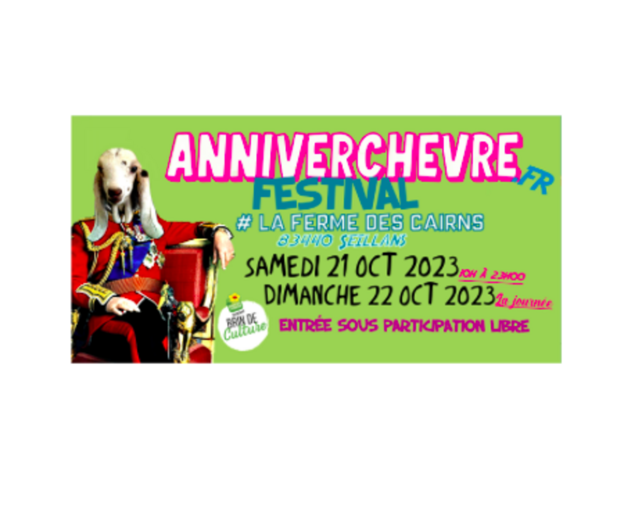 À partir de là vous nous aider vraiment et en échange on vous offre les 3 repas pour le week-end. Offre valable pour une personne, vous aurez votre nom sur une VIP liste et pourrez récupérer votre bon/coupon le jour de l'Anniverchèvre.
