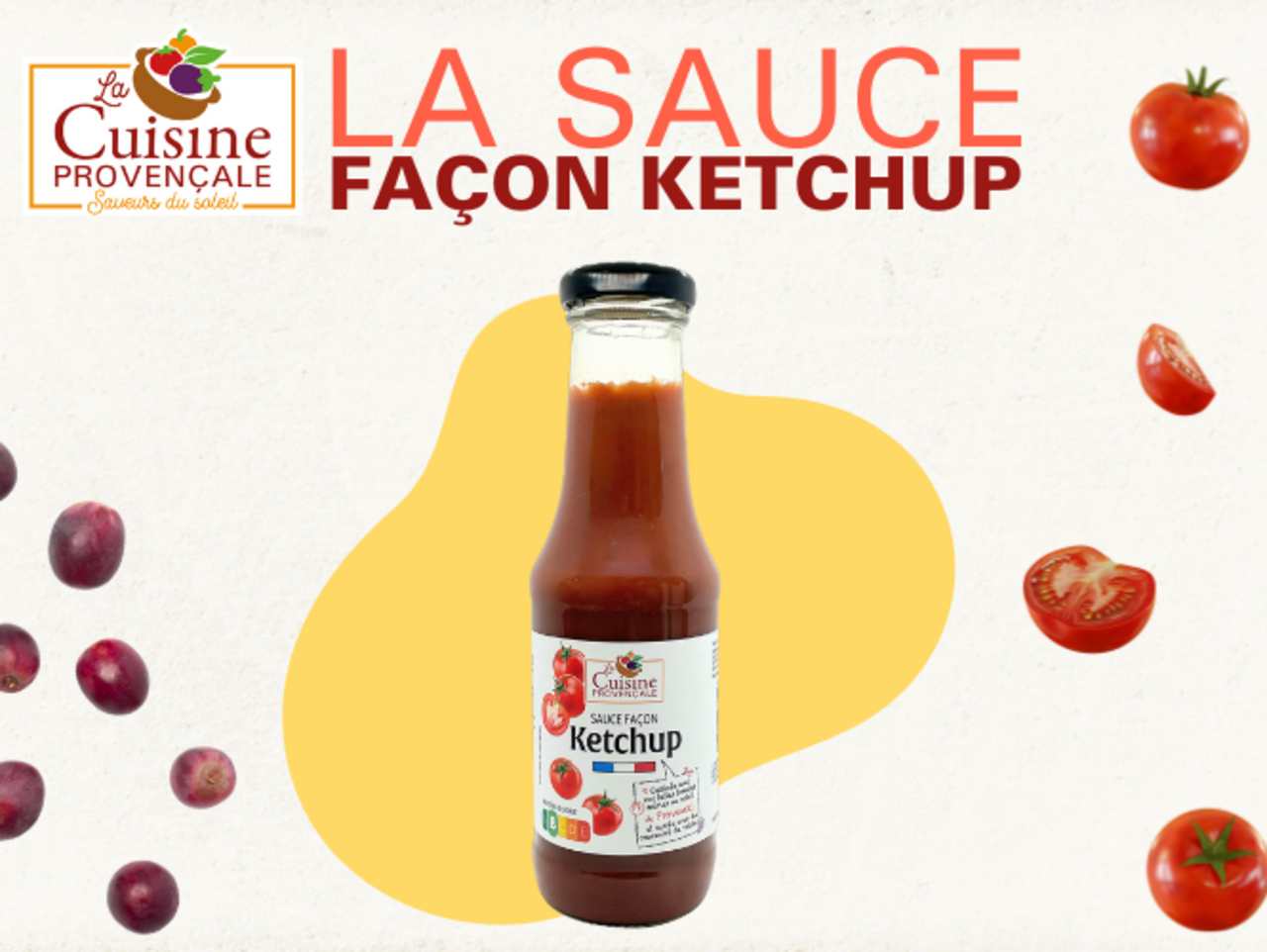12 bouteilles de sauce façon de Ketchup de 340g + 6 sauces tomates (Bio, Tomates Cerises, Oignon et Ail, piment d'espelette, Basilic et Pizza) + 1 bon cadeau de 15€ sur le site La Cuisine Provençale