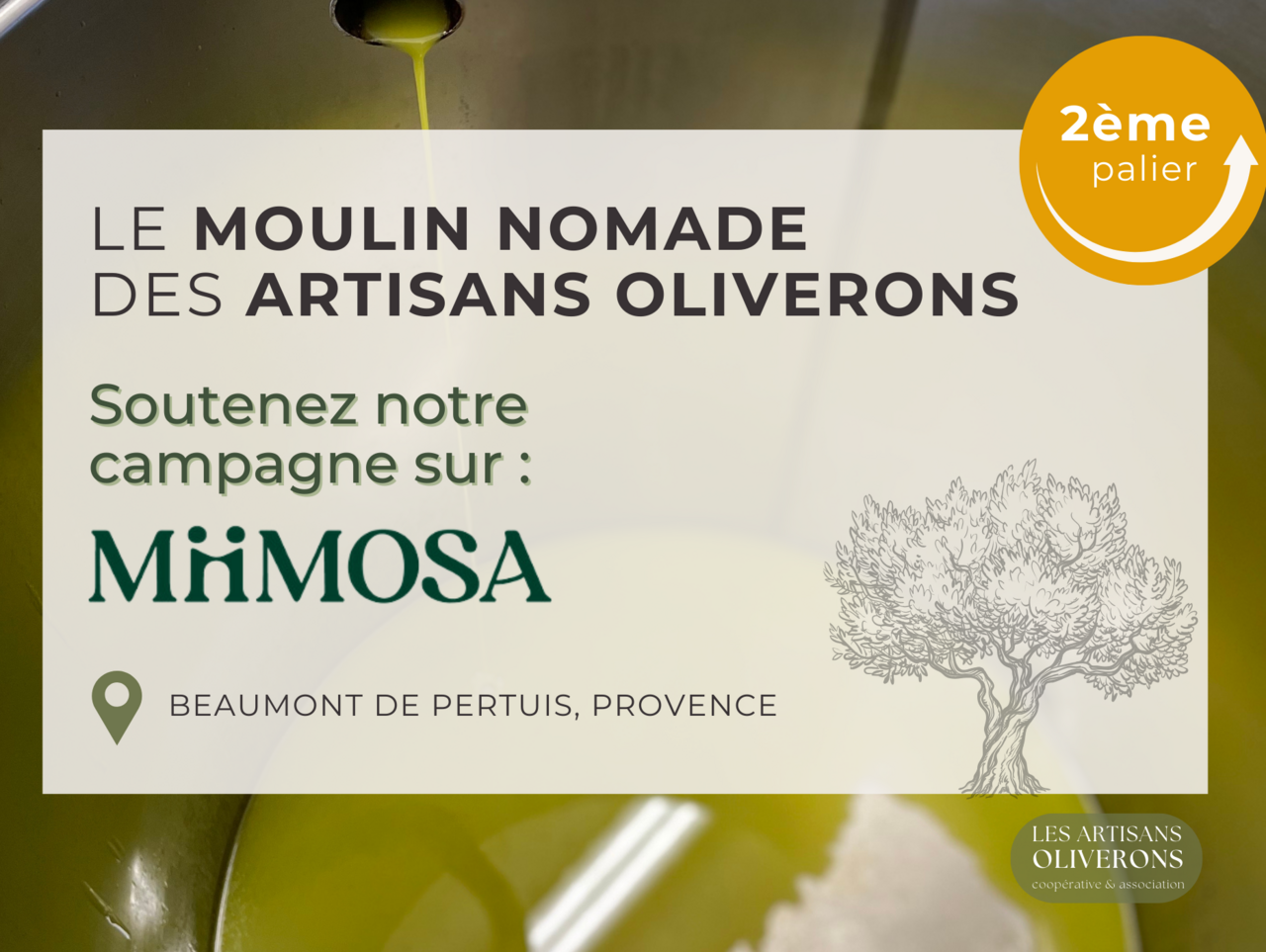 Pour mettre en mobilité le moulin existant (de marque Pieralisi, reconnue sur un plan international pour la qualité et l'ingénierie de son matériel) nous devons investir dans une remorque mais également aménager le moulin existant afin de l’adapter à une utilisation nomade. Il nous faut modifier le malaxeur du moulin existant afin d’optimiser la production continue d’oliviers et le temps passé sur site tout en garantissant le niveau de qualité premium et investir dans une laveuse-effeuilleuse intégrée pour alimenter le broyeur actuel. Le transfert de savoir-faire et la formation de plusieurs artisans oliverons à la conduite minutieuse du moulin est également prévue.