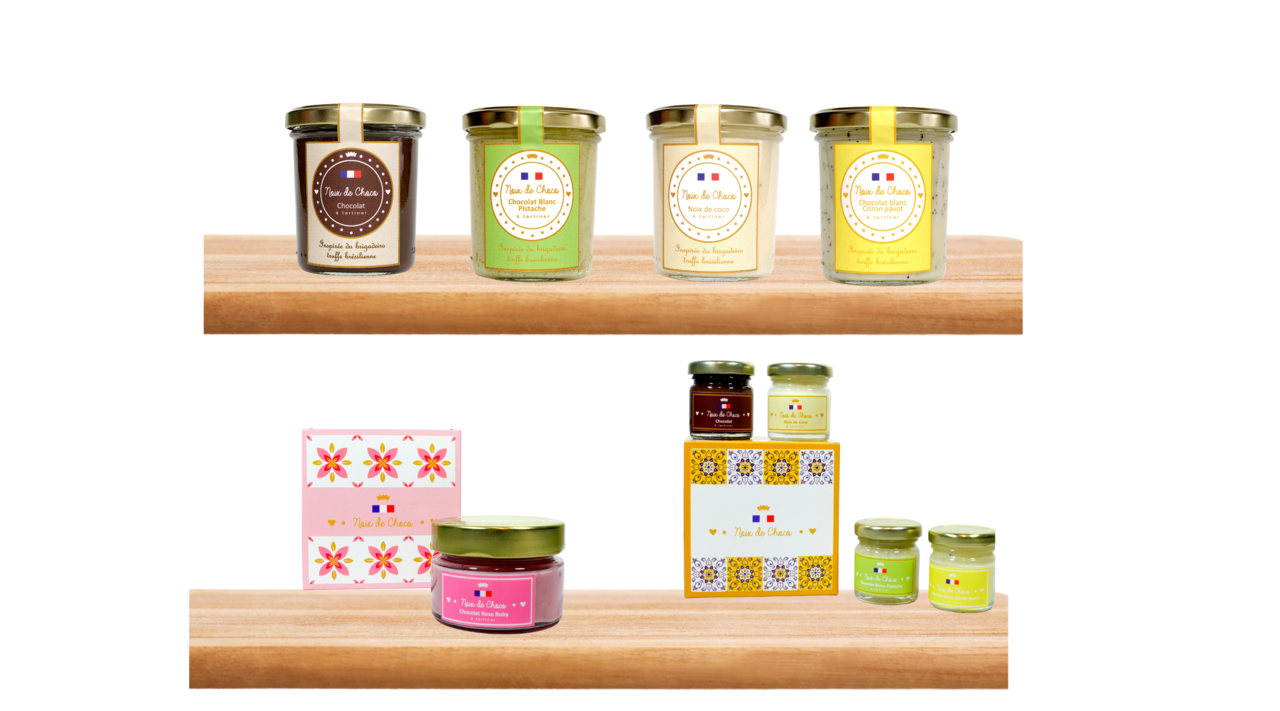 - 1 pot de pâte à tartiner chocolat 220g - 1 pot de pâte à tartiner noix de coco 220g - 1 pot de pâte à tartiner chocolat blanc pistache 220g - 1 pot de pâte à tartiner chocolat blanc citron pavot 220g - 1 pot de pâte à tartiner chocolat noir orange 220g - 1 pot de pâte à tartiner amandes 220g - 1 coffret rose Ruby : avec 1 pot de chocolat rose ruby 130g - Livraison point relais