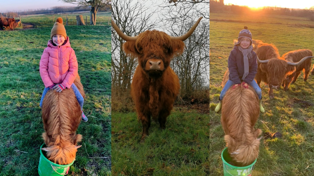 Aujourd'hui, les vaches laitières et leur suite ne suffisent pas à entretenir correctement les prairies humides. De ce fait, très rapidement, avec Dimitri, nos regards se sont tournés vers les vaches de race Highland Cattle, race atypique que j'affectionne tout particulièrement. Ces animaux sont magnifiques avec leurs robes rousse, grise, blanche ou noire. Leurs poils sont très longs pour les protéger des climats rudes auxquels ils sont habitués en Écosse. Les vaches sont de petites tailles, facilitant leurs déplacements dans les zones humides. Leurs cornes sont assez imposantes.