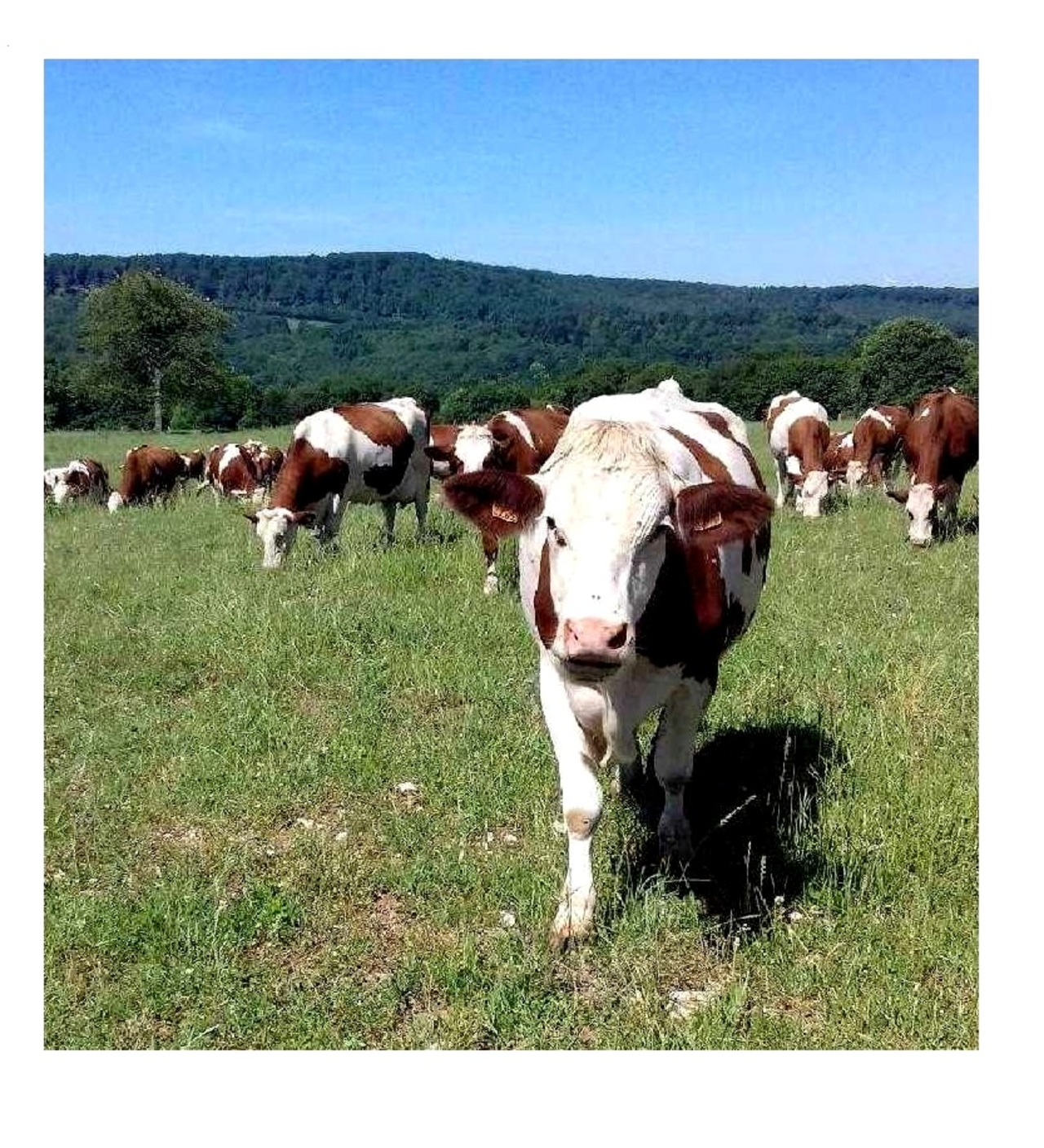 Mes parents et leur associé tiennent une ferme laitière depuis 1992 et bio depuis 2009, le GAEC de la Garenne à Soye. Nous avons 70 vaches laitières de race montbéliarde qui paissent tranquillement dans les pâturages attenants aux bâtiments. Elles mangent exclusivement la production de la ferme : foin, céréales. Nous travaillons avec l'homéopathie et la phytothérapie, nous recherchons aussi le meilleur confort pour nos vaches.