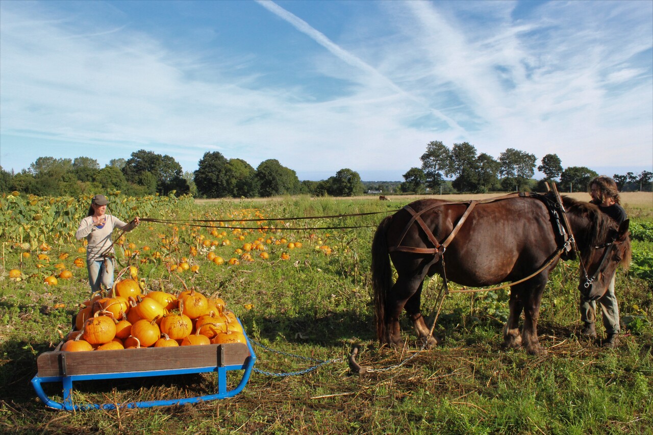 Et biensûr nos chevaux, qui nous aident dans le travail du sol (hersage, buttage...), les récoltes et les transports lourds. Ils permettent également l'entretien du site, une partie des terres étant consacrée aux prairies.